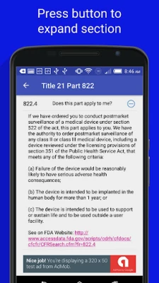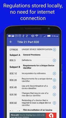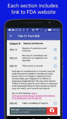 اس ایپلیکیشن میں Title 21 CFR کے وہ تمام کلیدی حصے شامل ہیں جو آپ کے کام کے لیے ضروری ہیں۔ ان میں 21CFR4 (کمبینیشن پروڈکٹس)، 21CFR11 (الیکٹرانک ریکارڈز اور دستخط)، 21CFR110 (انسانی خوراک کے لیے GMP)، 21CFR210 اور 21CFR211 (ادویات کے لیے GMP)، اور 21CFR820 (کوالٹی سسٹم ریگولیشن) جیسے اہم ضوابط شامل ہیں۔ ہر ضابطے کو منظم طریقے سے حصوں میں تقسیم کیا گیا ہے، جہاں ایک کلک سے آپ تفصیلات دیکھ سکتے ہیں اور دوبارہ کلک کرنے پر اسے چھپا سکتے ہیں۔ مزید برآں، ہر سیکشن ایف ڈی اے کی آفیشل ویب سائٹ پر ایک براہ راست لنک کے ساتھ آتا ہے، تاکہ آپ آسانی سے ضوابط کی تازہ ترین حیثیت کی تصدیق کر سکیں۔